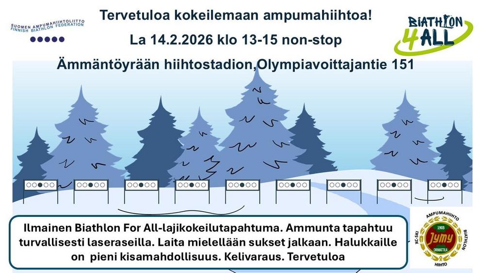 Biathlon For All-lajikokeilutapahtuma la 14.2.2026 klo 13-15 Ämmäntöyrään hiihtostadionilla.